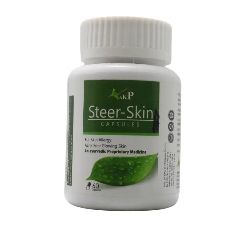 Steer Skin Capsules are a herbal formulation designed to support skin health, detoxification, and overall skin radiance. These capsules help in managing acne, pigmentation, rashes, and skin infections by purifying the blood and removing toxins from the body. The blend of potent Ayurvedic herbs nourishes the skin from within, promoting a healthy, clear, and youthful appearance. Regular use may help in managing skin conditions like eczema, psoriasis, and allergies.