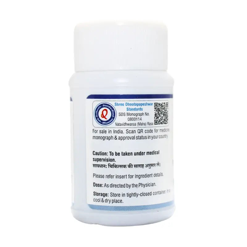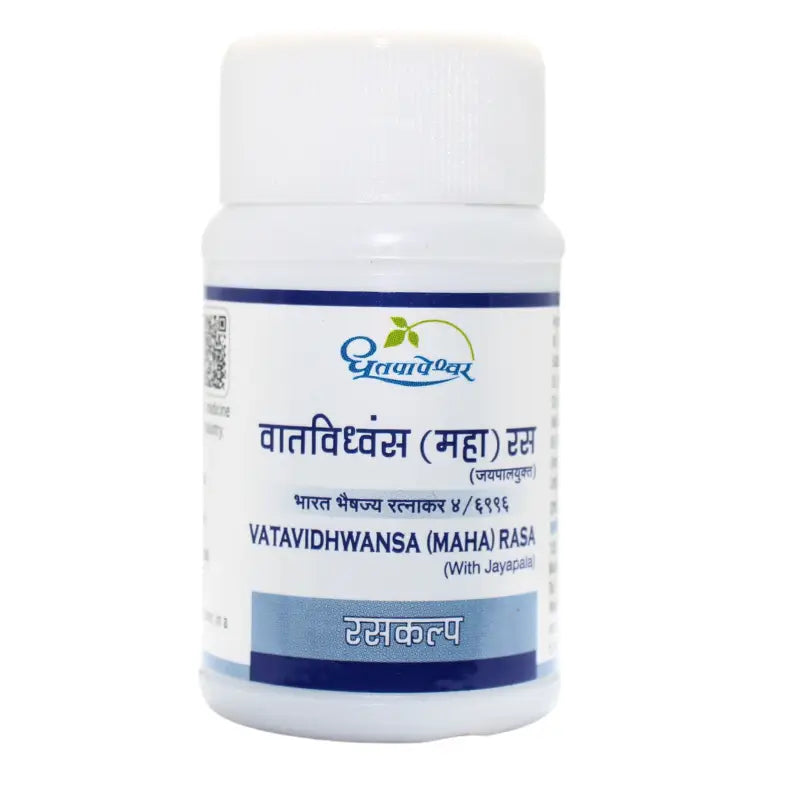 Shree Dhootapapeshwar Maha Vatvidhwansan Ras is a classical Ayurvedic formulation designed to help manage pain, inflammation, and digestive disorders. Enriched with potent ingredients like Shuddha Parad, Shuddha Gandhak, and Kapardika Bhasma, this formulation is beneficial for nervine and musculoskeletal health. It also supports bone and muscle regeneration while aiding in digestion and free radical protection.