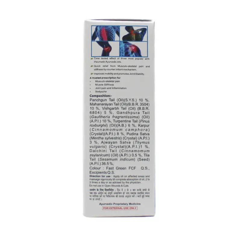 Gandhpura Oil (Gaultheria fragrantissima): Known for its natural anti-inflammatory and analgesic properties, it helps reduce swelling, stiffness, and chronic joint pain.