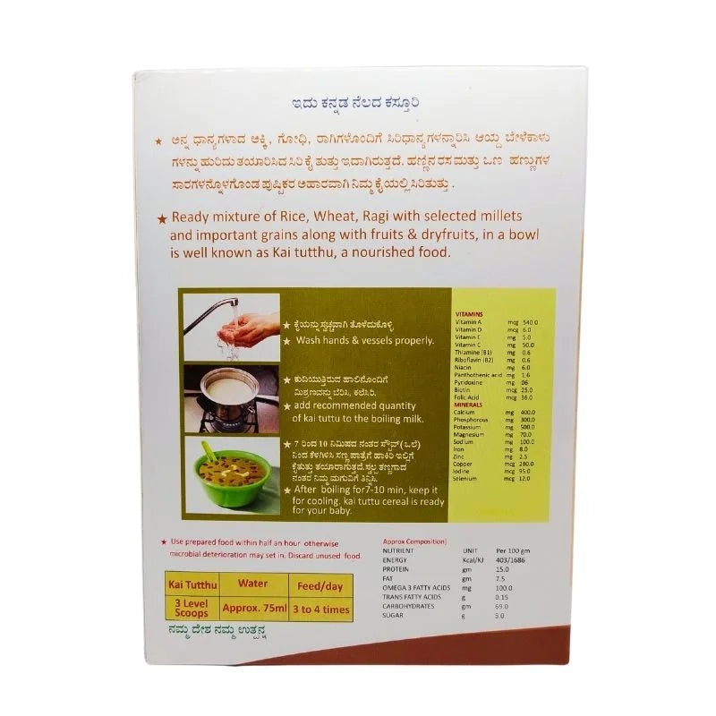 Kai Tutthu is a traditional and nourishing ready-to-eat mix formulated with a blend of organically sourced grains, millets, and essential nutrients. This wholesome food combines Rice, Wheat, Ragi (Finger Millet), Green Gram Dal, and select fruits and dry fruits, offering a balanced nutritional profile. Enriched with milk solids, vitamins, and minerals, this formulation provides sustained energy and supports overall health. Ideal for people of all ages, Kai Tutthu serves as a delicious and easy-to-digest meal, rich in protein, fiber, and essential micronutrients.