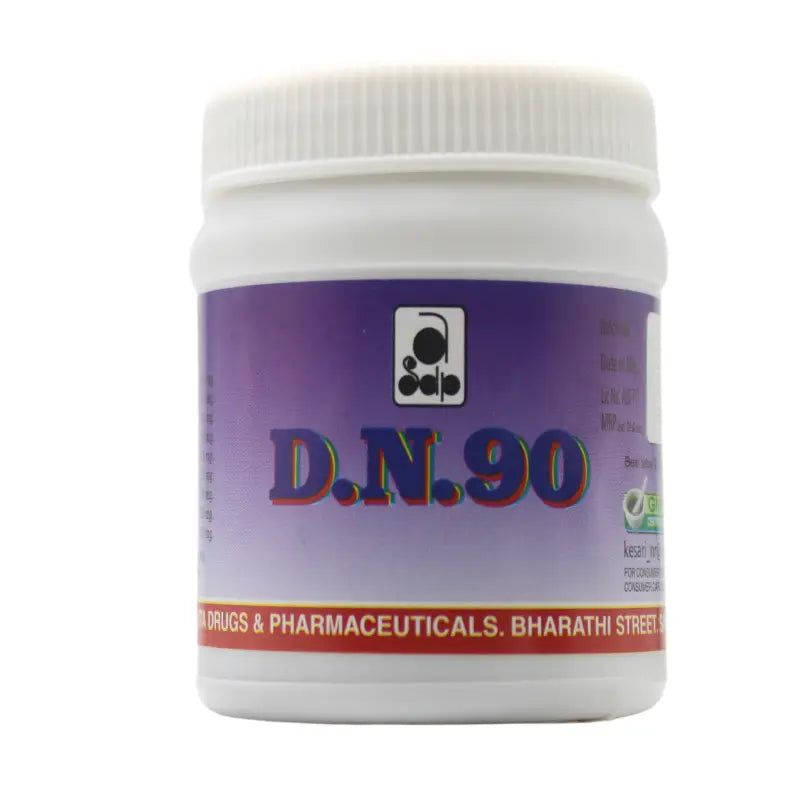 D N 90 Tablets are an Ayurvedic formulation crafted to support diabetes management. The blend of potent herbal ingredients works synergistically to regulate blood sugar levels, enhance pancreatic function, and improve glucose metabolism. Designed to support overall metabolic health, it provides a natural and effective approach to diabetes care.