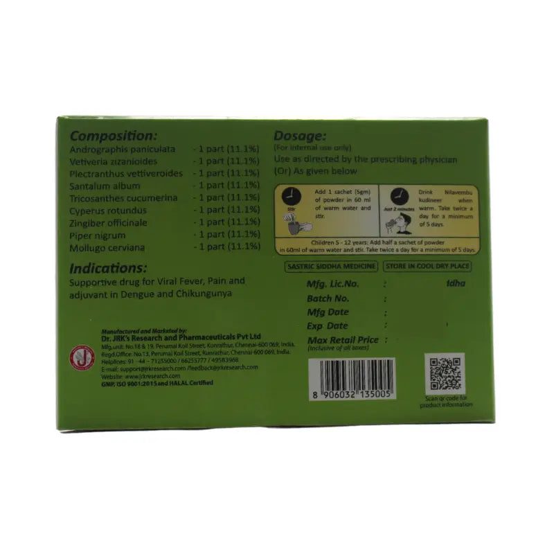Nilavembu Kudineer Churna is a traditional Sastric Siddha medicine that is clinically effective in the treatment of viral fever, Chikungunya, dengue, and associated pain. This herbal Ayurvedic supplement has a superior healing potential and is crafted to provide both preventive and supportive care during viral infections. The formulation is designed for easy consumption with its ready-to-drink formula, offering a patient-friendly solution to boost immunity and promote quick recovery from viral conditions.