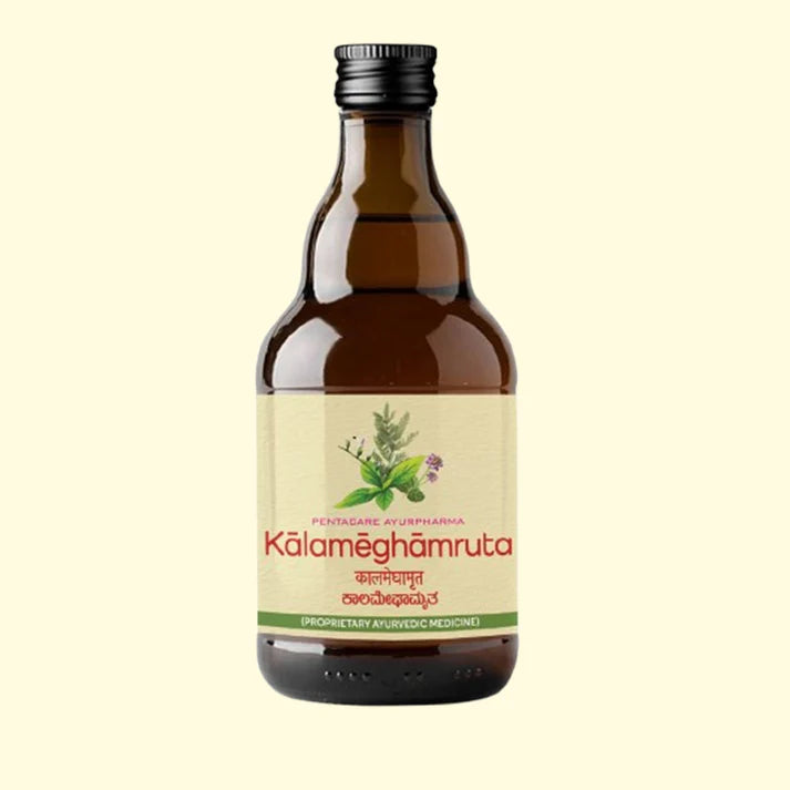 Kalameghamruta is a potent Ayurvedic syrup formulated by Pentacare Ayurpharma, designed to combat fever-related disorders like Jwara, Jeerna Jwara, and Vishama Jwara. This formulation is rich in powerful herbs that possess anti-pyretic, anti-infective, and analgesic properties, making it an effective remedy for reducing fever and associated symptoms. It supports the immune system by enhancing cellular metabolism and promoting healthy immune function. Kalameghamruta is ideal for individuals suffering from prolonged or intermittent fevers and those looking to improve their overall vitality and immune health.
