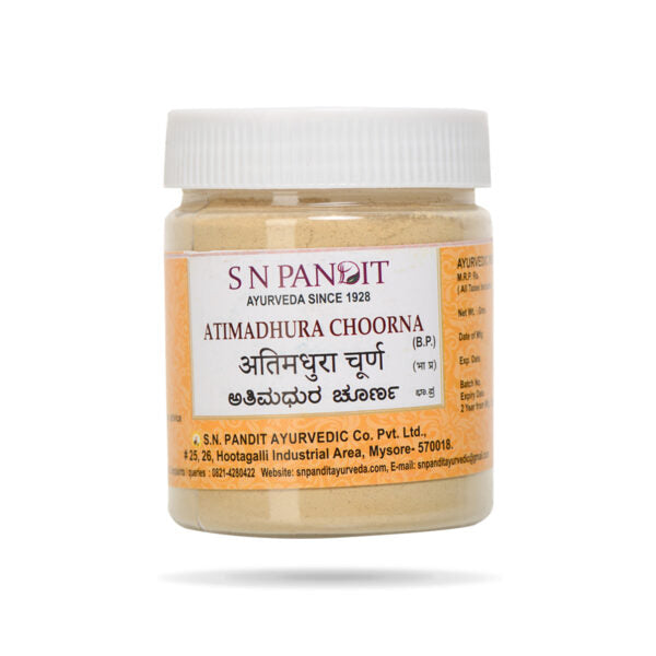 Atimadhura Choorna is the powder of “licorice”. The uses of atimadhura / licorice have been emphasized not only in our ancient ayurvedic texts but also in ancient Chinese system of medicine. Charaka samhita, one of the greatest treatise of ayurveda, has included atimadhura in various formulations. It is beneficial in treating hyperacidity, gastritis, dry cough & general debility.