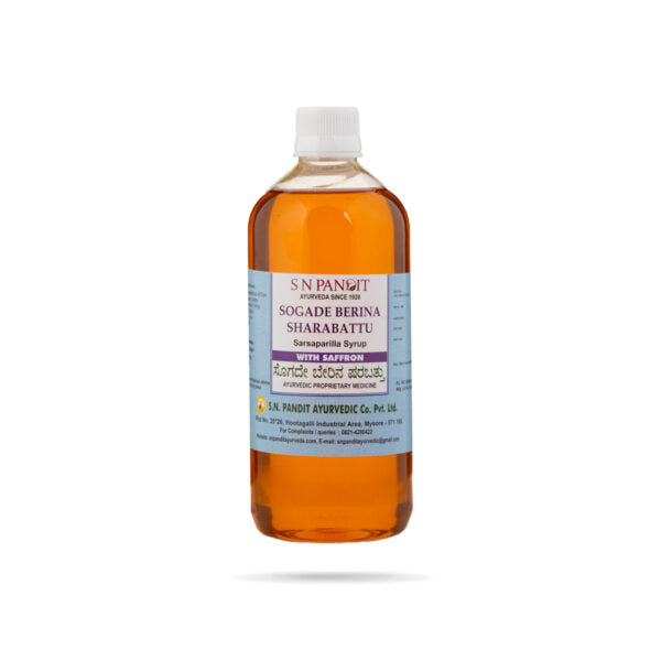 Sogade Berina Sharabattu is an extremely palatable syrup, made by harnessing the medicinal and volatile properties of Sariva (Nannari). Unlike other syrups, available on the market, under the same name, it is made by distillation of Sariva, thus preserving its medicinal and aromatic properties. It is tastefully made into a sweet syrup, with the addition of elaichi ( cardamom) and enriched its medicinal properties by the addition of pure Kashmiri saffron. It is the best to reduce aggravated heat (pitta) and helps fight heat exhaustion and hyperacidity. It promotes instant energy.