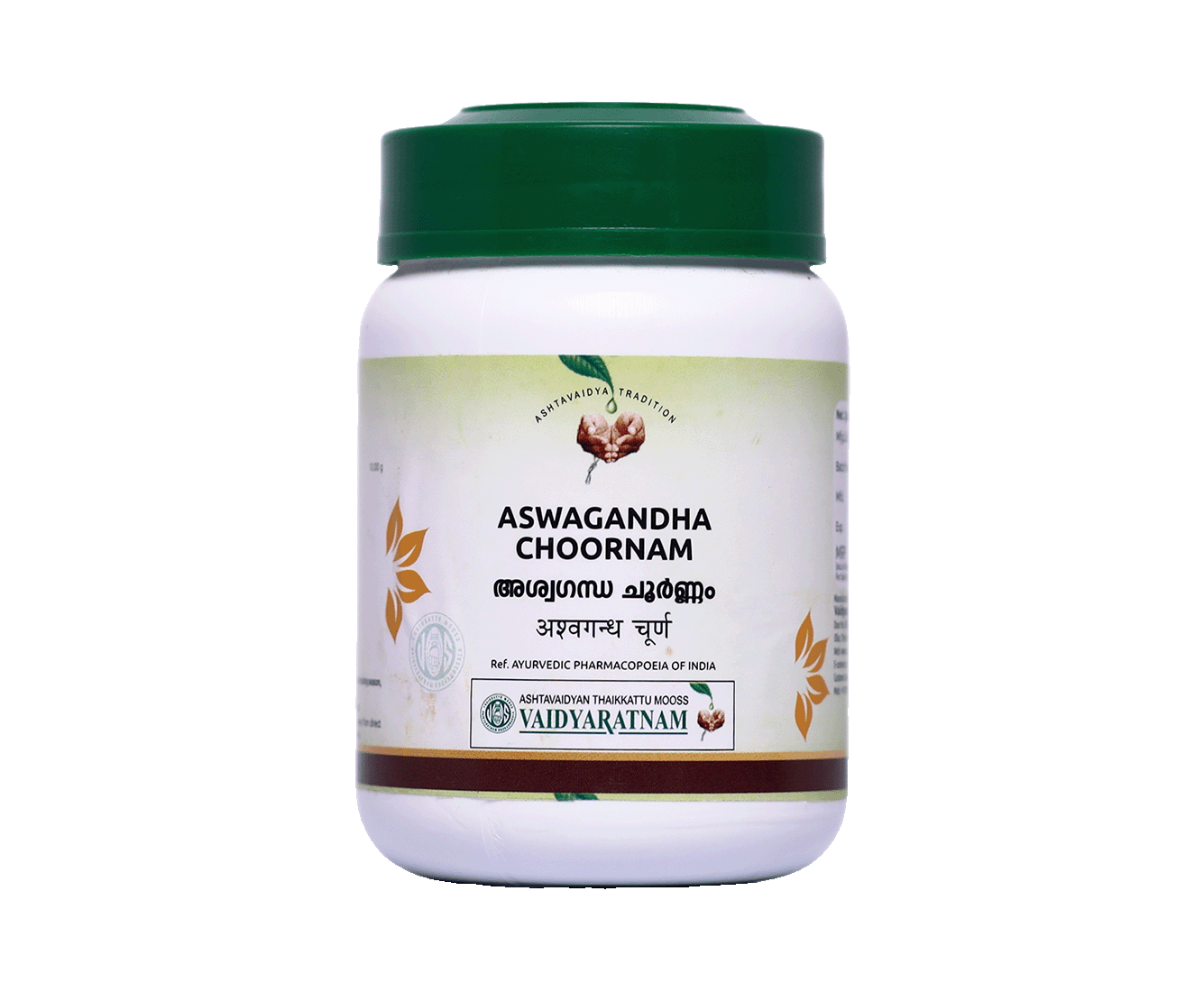Vaidyaratnam Aswagandha Choornam is a powerful Ayurvedic medicine for debility,emaciation and infertility. Formulated with the root of Withania somnifera, known for its rejuvenating properties. This herbal powder helps enhance vitality, reduce stress, and support overall health. Regular consumption boosts energy levels, improves mental clarity, and promotes hormonal balance, making it an effective remedy for impotence and related issues. Aswagandha is also known for its ability to improve stamina, support immune function, and alleviate fatigue. A natural, safe, and reliable choice, it helps restore physical and mental well-being.
