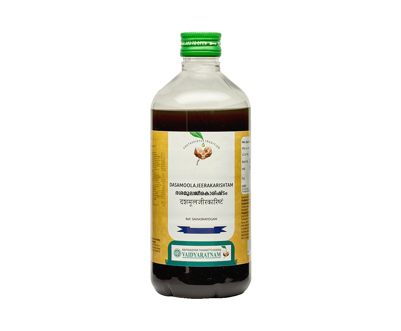 Vaidyaratnam Dasamoolajeerakarishtam is a powerful postnatal medicine and treat breathing and bloating difficulties. This herbal tonic combines the benefits of Dasamoola (a group of ten medicinal herbs) and Jeeraka (cumin), known for their digestive and carminative properties. It helps in relieving postnatal bloating, improving appetite, and easing digestion. Regular consumption aids in restoring digestive health, alleviating gas, and preventing indigestion.
