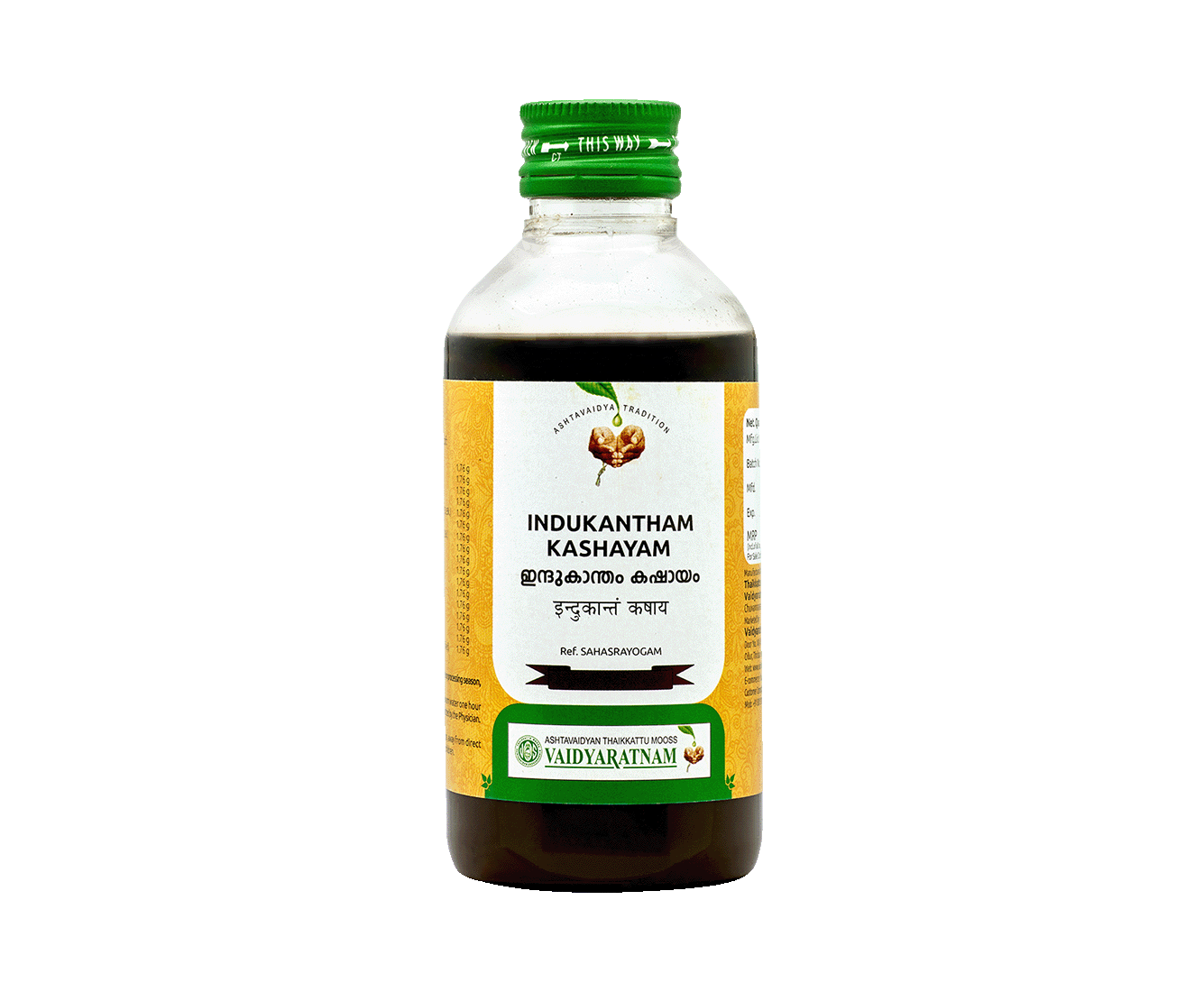 Indukantham Kashayam is a potent Ayurvedic herbal decoction, meticulously formulated by Vaidyaratnam, a renowned Ayurvedic institution. This traditional medicine is a concentrated blend of various herbs, each contributing to its overall therapeutic properties.