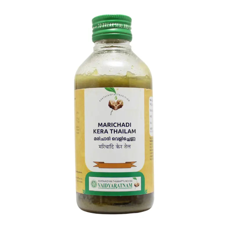 Marichadi Kera Thailam is an Ayurvedic herbal oil specifically formulated to provide relief from common respiratory ailments such as chronic rhinitis, sinusitis, tonsillitis, cold, and cough. This external-use oil combines the natural healing properties of carefully selected herbs, promoting respiratory health and alleviating discomfort caused by these conditions. The oil can be used topically to relieve congestion, reduce inflammation, and support the body's natural healing process.