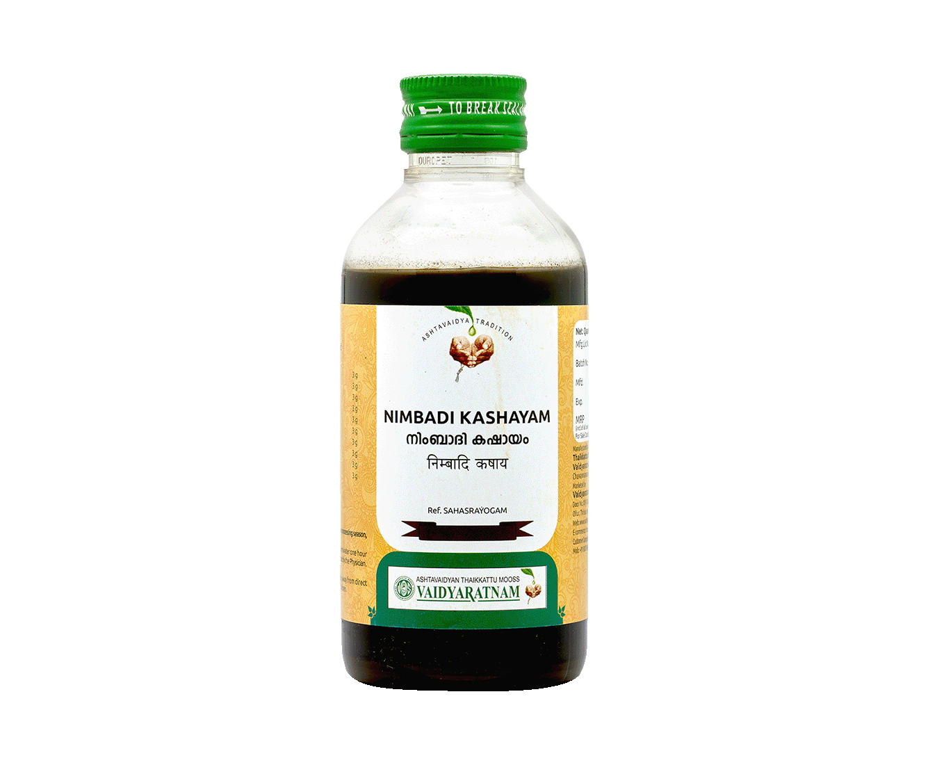 Vaidyaratnam Nimbadi Kashayam is a potent Ayurvedic medicine for skin ailments,abscess, boils, and promoting overall skin health. Made with powerful ingredients like Neem, this formulation boasts strong antimicrobial and anti-inflammatory properties, making it ideal for treating boils, abscesses, and skin irritations. It helps detoxify the body, reduces inflammation, and accelerates the healing process of boils and other skin conditions. Regular use of Nimbadi Kashayam supports healthy, clear skin and enhances immunity. Ideal for both internal and external use, it provides natural relief and encourages the body’s ability to fight infections.