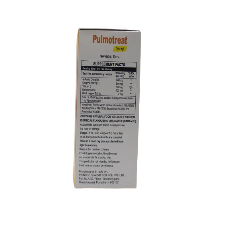 Pulmotreat Syrup is a specially formulated herbal and nutritional blend designed to support respiratory health and lung function. It is beneficial for individuals recovering from respiratory illnesses, including those undergoing pulmonary rehabilitation post-COVID. The syrup helps relieve chest congestion, bronchospasms, and symptoms of obstructive lung diseases such as asthma and bronchitis. Enriched with powerful antioxidants and anti-inflammatory agents, Pulmotreat Syrup aids in reducing respiratory mucus, alleviating inflammation, and strengthening the immune system. With the combined benefits of N-Acetyl Cysteine, Nanocurcumin, and herbal extracts, this formulation helps improve respiratory efficiency and supports overall lung health.