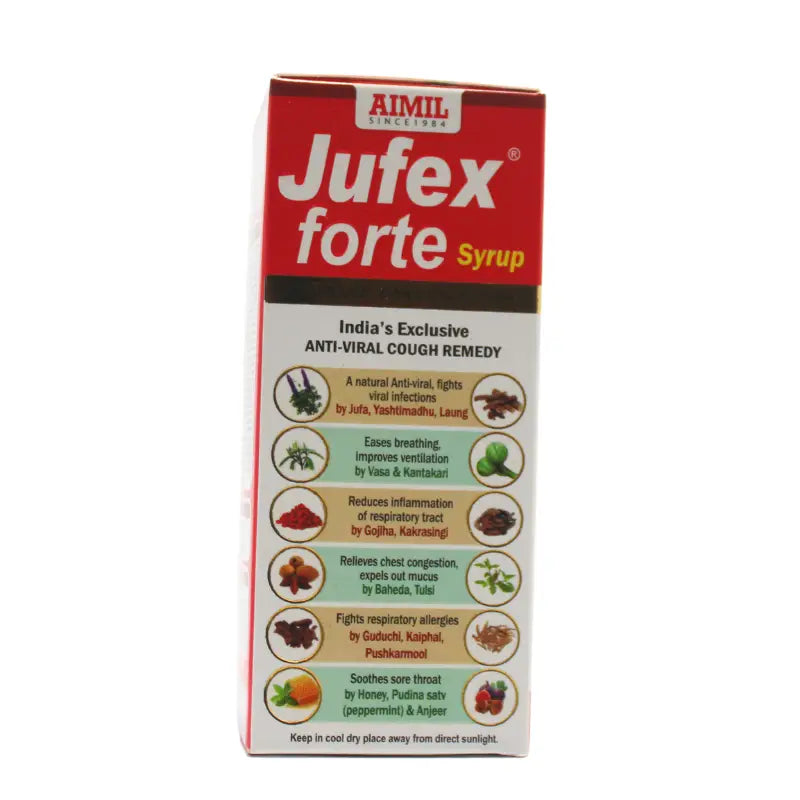 Jufex Forte Syrup is an Ayurvedic herbal formulation designed to combat respiratory tract infections, alleviate cough, sore throat, and congestion. Suitable for all ages, it enhances bioavailability in antibiotic-resistant patients by promoting rapid absorption from the gastrointestinal tract and strengthens respiratory functions.
