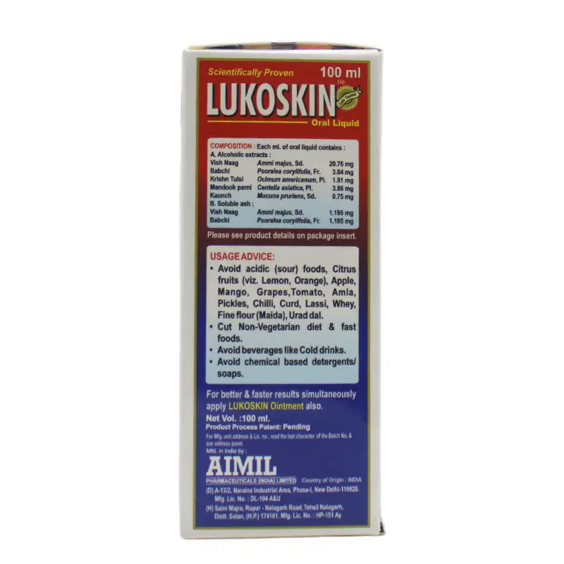 Aimil Lukoskin Liquid is a polyherbal Ayurvedic formulation designed to support skin health and pigmentation balance. This unique formula aids in restoring normal skin pigmentation by improving melanin synthesis. Developed by the Defence Institute of Bio-Energy and Research (DIBER), a unit of the Defence Research and Development Organisation (DRDO), Lukoskin is known for its therapeutic potential in managing various skin conditions. With its blend of potent herbal extracts and bio-enhancers, this liquid formulation helps reduce skin irritation, improve immune response, and promote overall skin wellness. It is particularly beneficial for individuals experiencing uneven skin tone, hyperpigmentation, and conditions associated with skin discoloration.