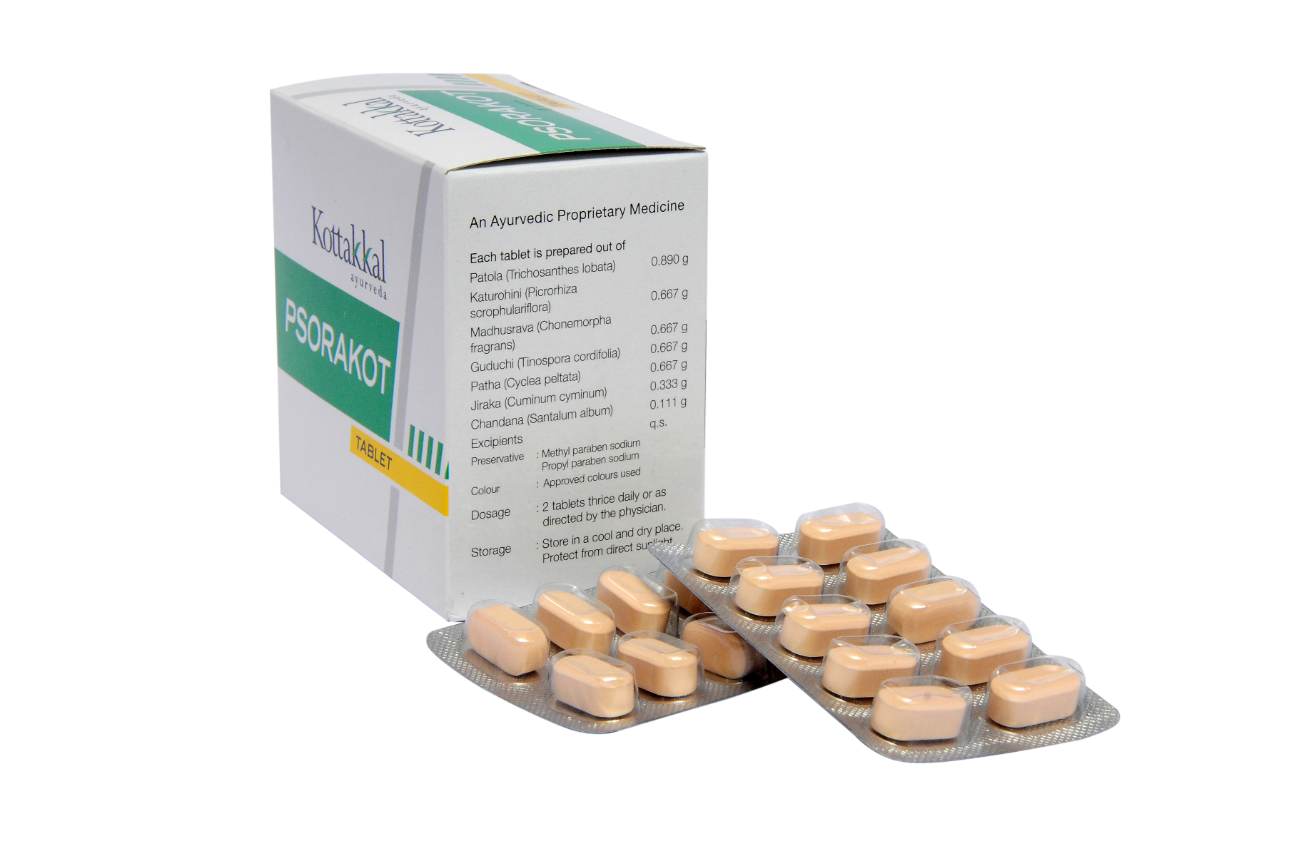 Psorakot Tablet balances all three doshas and supports heated skin conditions by calming inflammation, improving circulation, and eliminating ama from the digestive system.