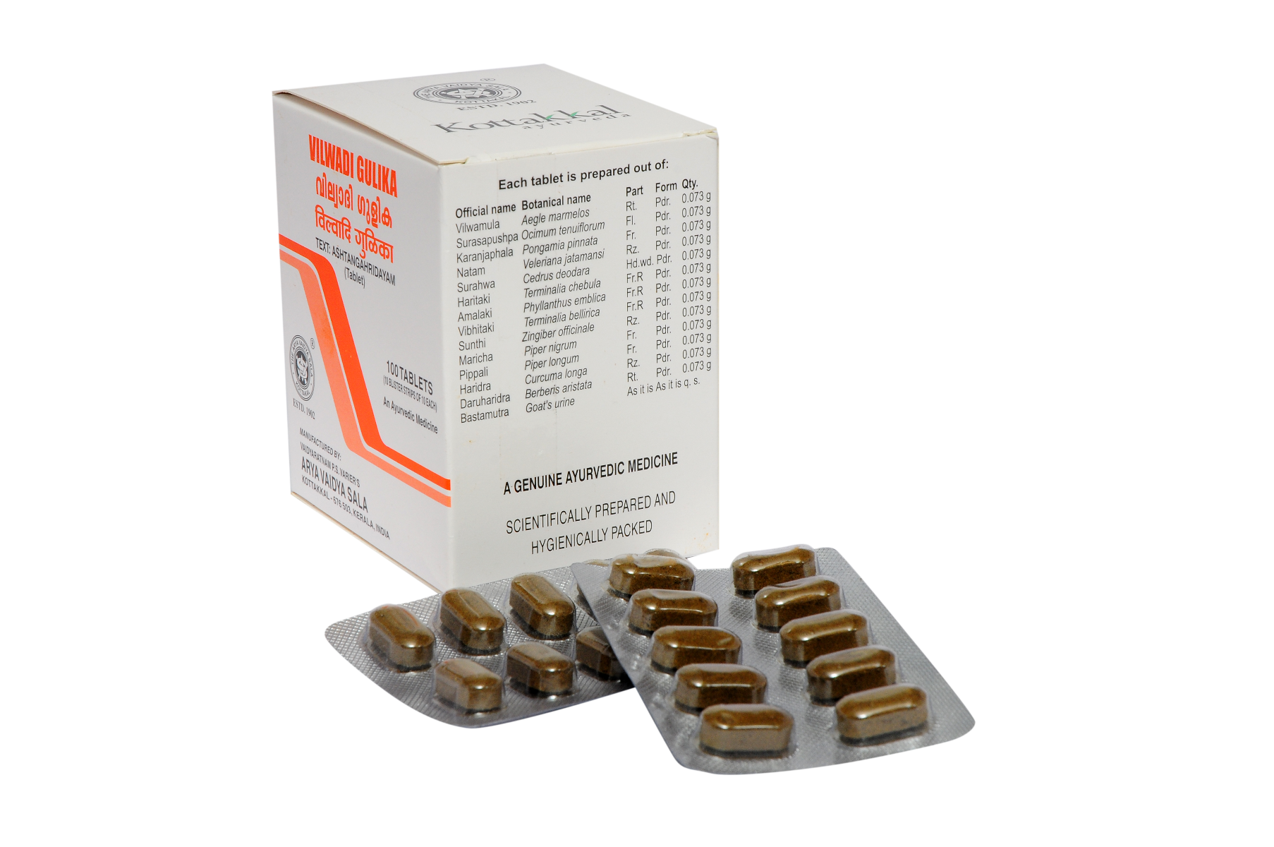 Kottakkal Ayurveda Vilwadi Gulika Tablet can be used to relieve bug bites from scorpions, rodents, and spiders, among other things. It can be used to relieve gastroenteritis, fever, and dyspepsia. It contains Pippali, which aids in the removal of toxins from the body and the management of liver toxicity. It also contains Amalaki, a vitamin C-rich fruit that boosts the immune system and improves overall health by reducing stress and weakness.
