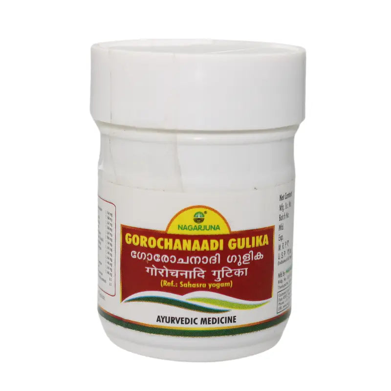 Nagarjuna Gorochanadi Gulika is a traditional Ayurvedic tablet widely used in the management of respiratory disorders, digestive issues, and neurological conditions. This formulation contains a blend of potent herbs, minerals, and animal-derived ingredients, making it effective in alleviating fever, cold, bronchitis, asthma, and digestive ailments. Additionally, it supports cognitive function and aids in memory retention.