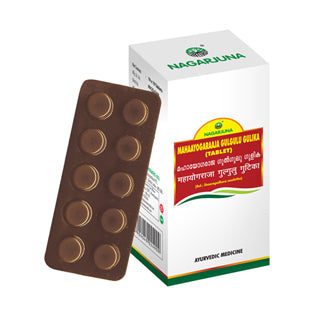 Nagarjuna Mahaayogaraaja Gulgulu Gulika contains Ginger, Long Pepper, Chavya, Pippalimoola, Chitraka, Hingu, Ajamoda, Sarshapa, Shwetajeeraka, Krishnajeeraka, Renuka, Indrayava, Patha,Vidanga, Gajapippali, Katuka, Ativisha, Bharangi, Vacha, Murva, Triphala, Shudha Guggulu, Vanga, Bhasma, Roupya Bhasma, Naga Bhasma, Loha Bhasma, Abhraka Bhasma, Madhura Bhasma And Rasasindhura as a combination of ingredients.