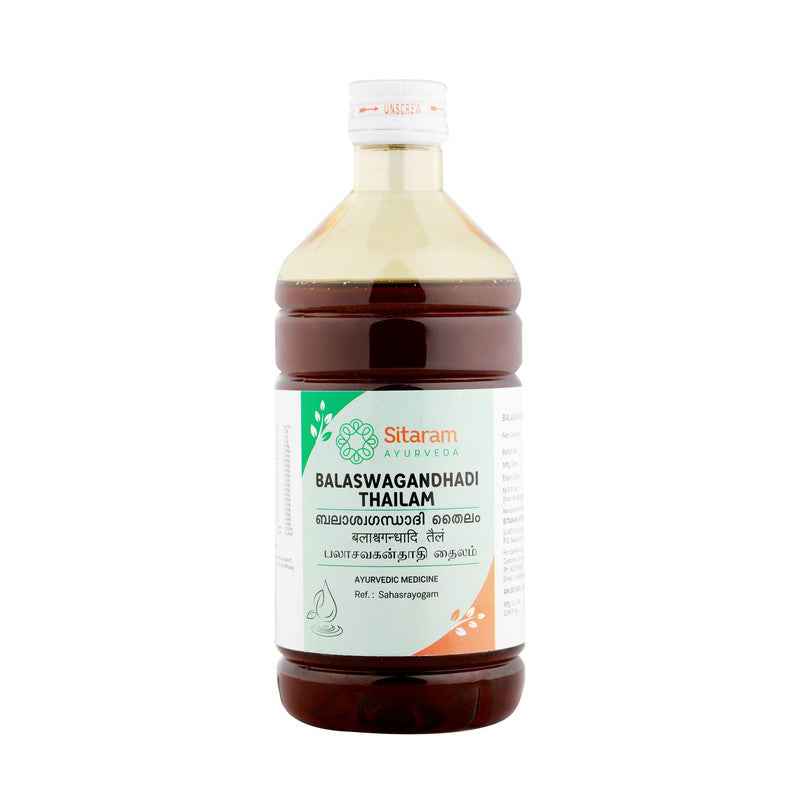 This medicated oil is a combination of several herbs like Bala(Sida cordifolia), Laksha (Lacciferra lacca) , Aswagandha(Withania somnifera) etc in a warming base of sesame oil.