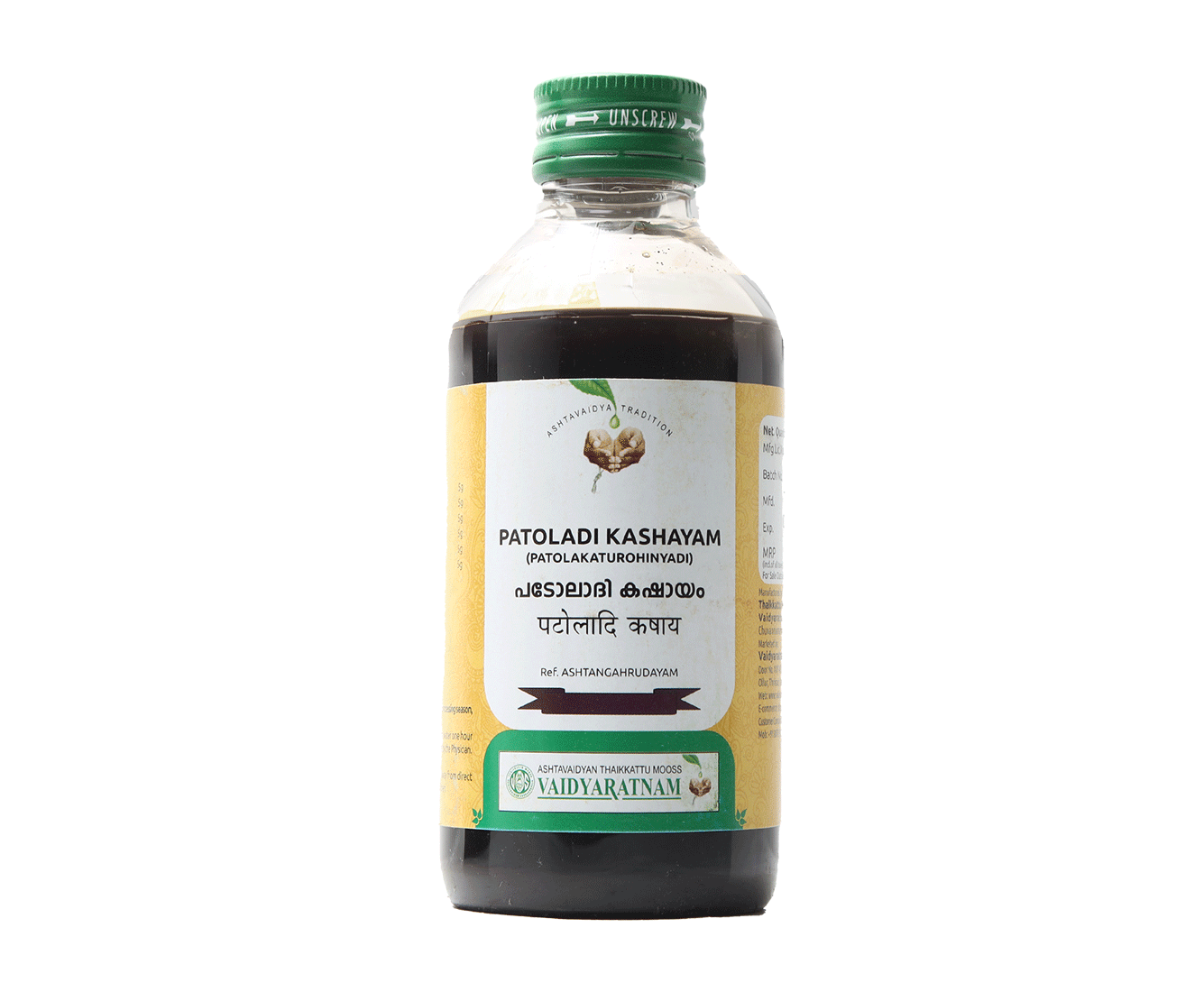 Vaidyaratnam Patolakaturohinyadi Kashayam (Patoladi Kashayam) 200 ML is an Ayurvedic remedy formulated to combat fever, jaundice, and various skin conditions such as scabies and pruritus. Made from natural ingredients, it promotes overall wellness by addressing imbalances effectively.